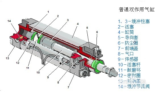 以氣動系統中常使用的單活塞桿雙作用氣缸為例來說明,氣缸典型結構如下圖所示。它由缸筒、活塞、活塞桿、前端蓋、后端蓋及密封件等組成。雙作用氣缸內部被活塞分成兩個腔。有活塞桿腔稱為有桿腔,無活塞桿腔稱為無桿腔。