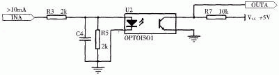 圖2為一路檢測脈沖輸入信號電路(另一路完全相同)。INA為輸入信號,是由光電傳感器采集到的閥門脈沖信號(>10mA)。該信號經(jīng)旁路電容濾波后送入光耦,轉換成了輸出的OUT電壓信號送入單片機。輸出的電壓可直接進入單片機的I/O口。在控制中,要求A、B兩路脈沖都接收到的時候,才認為是由信號輸入,AB為正轉,BA為反轉。只有一路信號輸入時不計數(shù)。